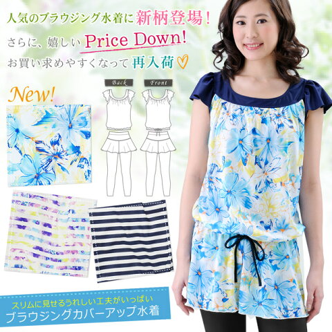 【送料無料】 UV対策 身体のラインを隠すデザイン水着 ブラウジング カバーアップ水着 上下セット(9M〜15LL) / 水陸両用 体型カバー 体型隠し お腹カバー ママ水着 リゾート水着