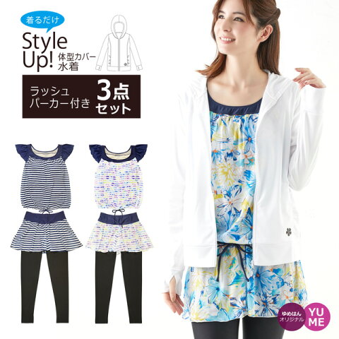 [アフターセール限定 35%] UVカット 体型カバー水着 ブラウジングタイプA ラッシュパーカー付き 3点セット 9M 11L 13L 15LL 水陸両用 体型カバー 大きいサイズ 体型隠し 30代 40代 50代