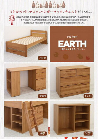 サイズ ・ベッド(ミドルベッド時):幅105cm×長さ202cm×高さ122.1cm ・ベッド(シングルベッド時):幅105cm×長さ202cm×高さ77.6cm ・ハシゴ:幅35cm×奥行10cm×高さ104cm ・チェスト:幅85cm×奥行40cm×高さ72.5cm ・デスク:幅120cm×奥行53cm×高さ72.5cm ・シェルフ:幅105cm×奥行44.5cm×高さ81.5cm ・マットレス:幅97cm×奥行195cm×高さ10cm 材質 天板・前板:アルダー無垢材(ポリウレタン樹脂塗装) 側板など一部:MDF・プリント化粧板背面化粧仕上げ カラー アルダー無垢ナチュラルカラー。